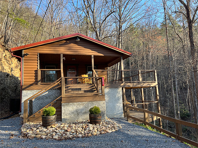 This cozy, secluded cabin is tucked away in a lush mountain forest where there is spectacular fall foliage and lots of privacy. It features 2 bedrooms, 2 bathrooms, fully furnished kitchen and spacious sitting room with an inviting electric fireplace. Enjoy the beautiful outdoors from the viewing deck, spacious backyard, front porch, back porch and lower private porch. The private lower porch features a large porch swing, perfect for enjoying the scenic views and sounds of nature. The back porch has a 6 person hot tub for unwinding after a busy day in Pigeon Forge, Dollywood or Gatlinburg. This property also has a small waterfall and gentle mountain stream which can be enjoyed from any of our outdoor areas.